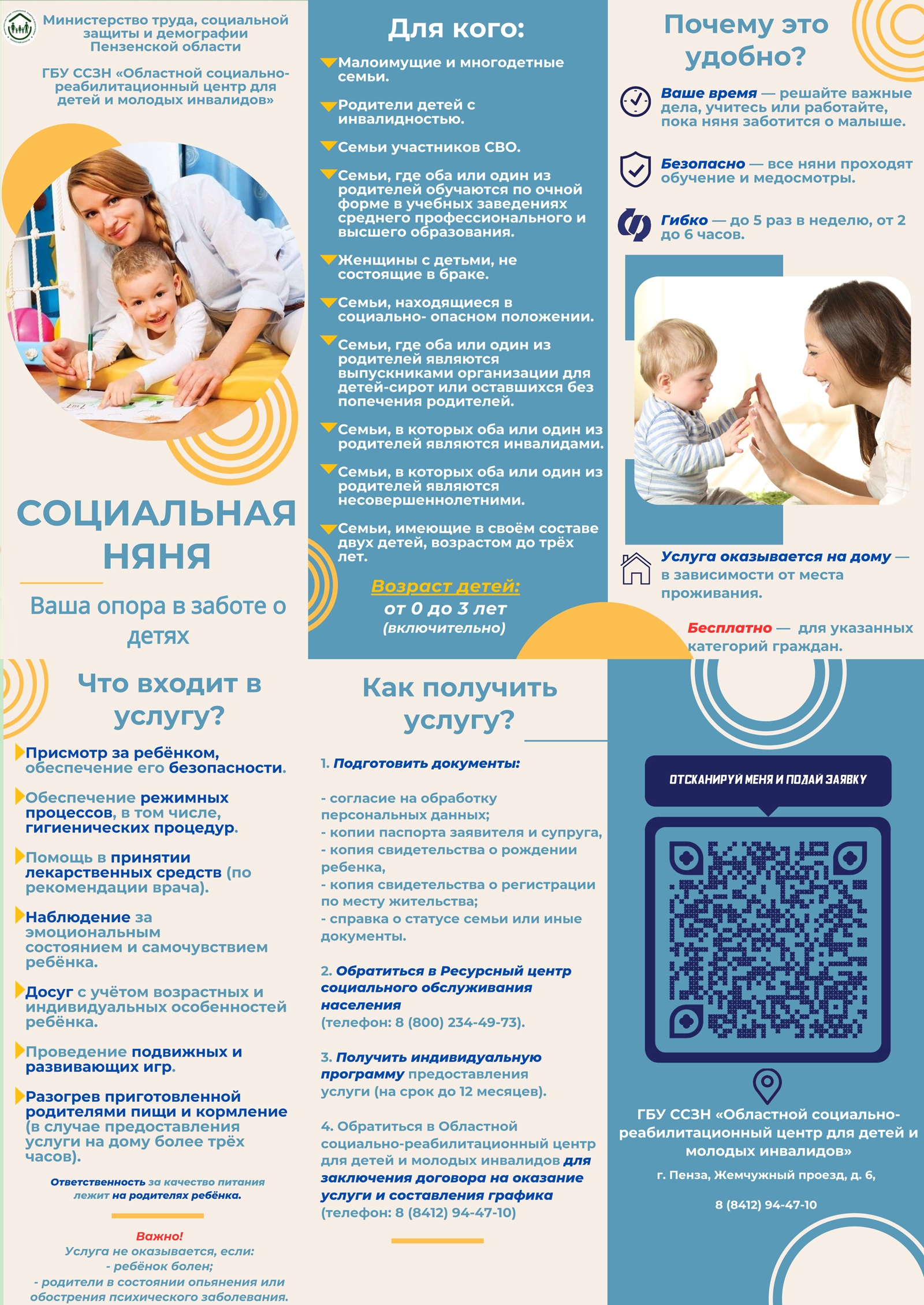 Услуга «социальная няня» — инновационный сервис профессиональной помощи семьям с детьми, предлагающий гибкий и индивидуально настраиваемый график посещений, предоставляется бесплатно на период до 5 раз в неделю от 2 до 6 часов.