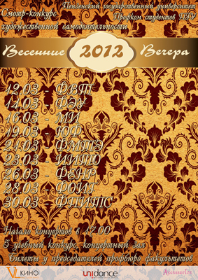 Все студенты Пензенского государственного университета замерли в ожидании главного события студенческой жизни - марафона межфакультетского смотра-конкурса художественной самодеятельности "Весенние вечера - 2011". В конкурсе принимают участие представители 10 факультетов университета. Это <<золотая молодежь>> - самые сильные, умные, умелые молодые люди <<политеха>>, плюс филиалы в Кузнецке и Сердобске. Это не только студенты и студентки, не только пара сотен тех, кто участвует в подготовке и проведении конкурса, но и сотрудники, преподаватели университета, студенты других вузов города! Приглашаем всех желающих, билеты - у председателей профбюро факультетов.