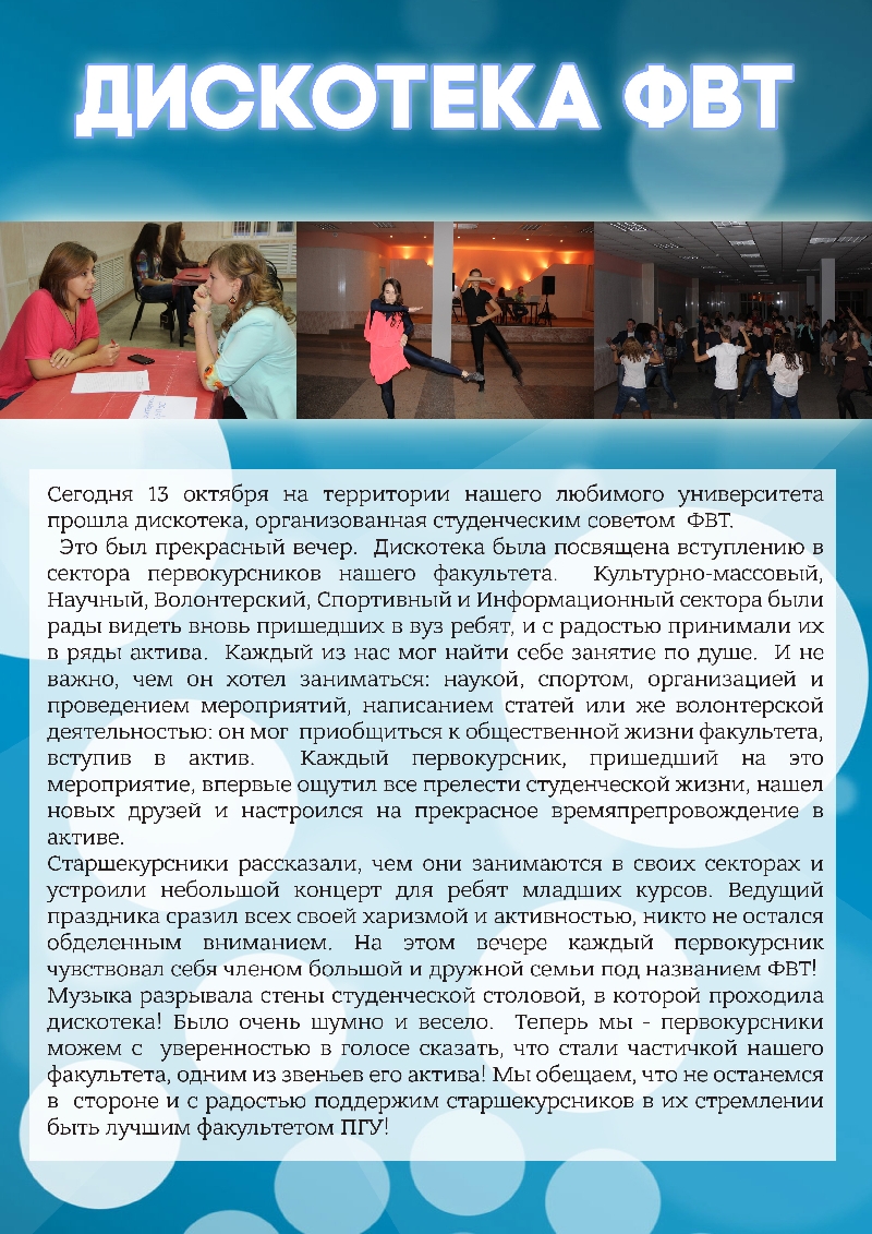 13 октября прошла дискотека, организованная студенческим советом ФВТ.
