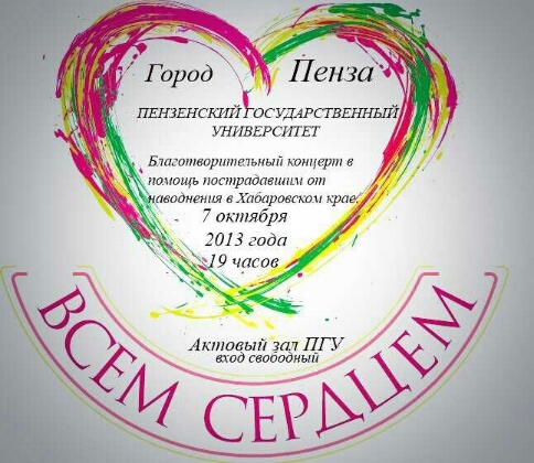 Сегодня, 7 октября, в 19.00 в киноконцертном зале ПГУ состоится Благотворительный концерт в помощь пострадавшим от наводнения на Дальнем Востоке. Приглашаем всех присоединиться, ведь только в единстве наша сила.