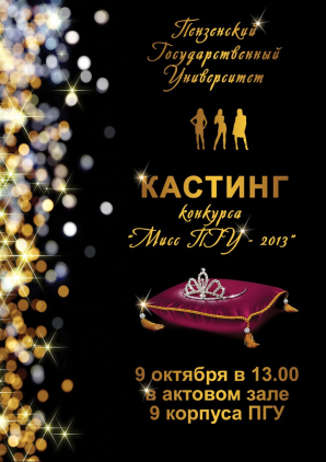 В среду, 9 октября, в 13.00 состоится кастинг на МИСС ПГУ. Ждем самых очаровательных представительниц факультетов ПГУ.