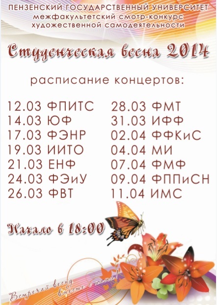 В течение месяца самые творческие, музыкальные и артистичные будут соревноваться за звание победителя самого популярного студенческого конкурса и за право выступать на Гала-концерте «Студенческая весна – 2014» Пензенского государственного университета, который пройдет 23 апреля в новой Филармонии.