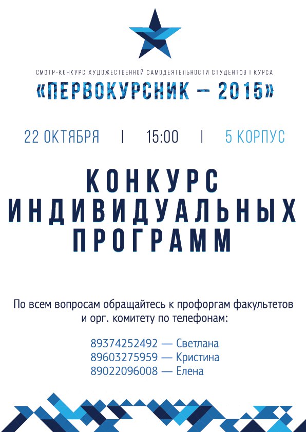 В рамках смотра-конкурсы "Первокурсник-2015" 22 октября будет проходить конкурс индивидуальных программ.