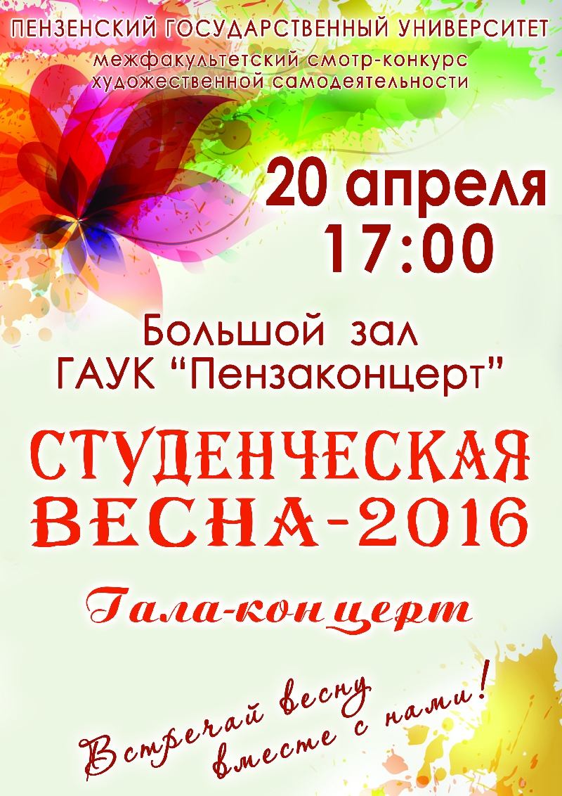 20 апреля в 17:00 на сцене новой филармонии ГАУК ПО «Пензаконцерт» состоится гала-концерт межфакультетского смотра-конкурса художественной самодеятельности «Студенческая весна - 2016»! Только лучшие вокальные и танцевальные номера, яркие оригинальные номера, и конечно же награждение победителей! Ждем Вас за удивительными эмоциями и хорошим настроением!