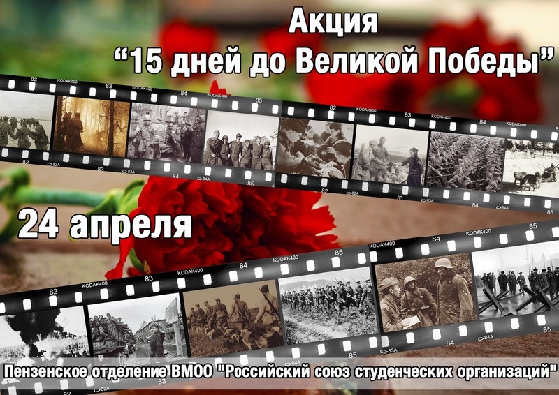 24 апреля 2016 года в городе Пенза прошла Международная студенческая гражданско-патриотическая акция «15 дней до Великой Победы» под эгидой Пензенского отделения ВМОО «Российский союз студенческих организаций» и активистов ПГУ, ПГСХА, ПГУАС. Данная инициатива была поддержана Главой города В.П. Савельевым. Активисты Пензенских вузов выставили почетный караул с 14.00 ч. до 16.00 ч. на разных точках города. Студенты ПГУ несли Вахты Памяти на следующих монументах: Памятник Победы, Памятник Проводы на фронт, Митрофаньевское кладбище, монумент Танк Т-34. В акции поучаствовали 80 студентов. На каждой точке акции волонтеры ИФФ подготовили экскурсию.