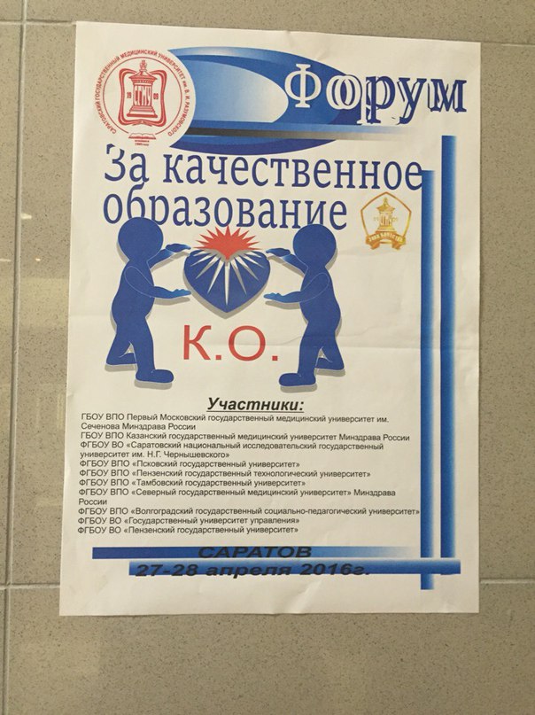 С 27 по 28 апреля 2016 года в Саратовском государственном медицинском университете проходил Всероссийский форум по вопросам оценки и повышения качества образования, направленный на формирование предложений по развитию механизмов включения обучающихся в оценку и повышение качества образования.