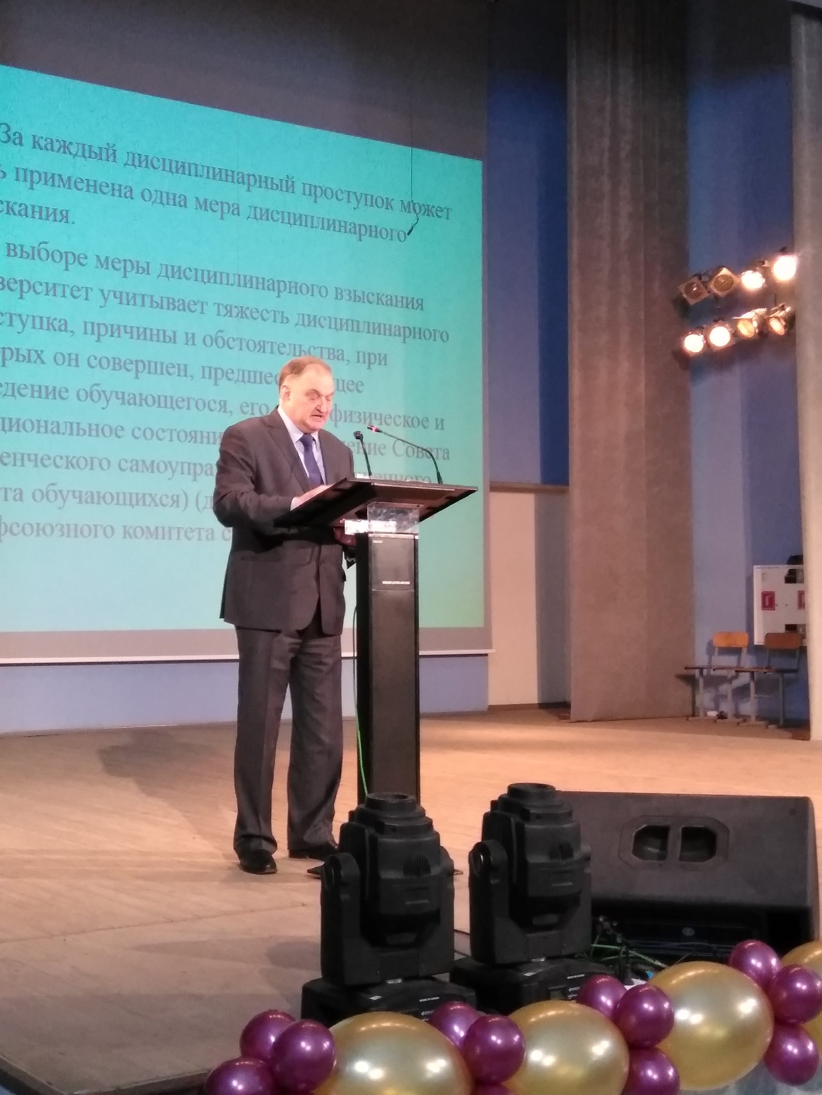 Встречу открыл проректор по воспитательной и социальной работе университета Юрий Васильевич Ерёменко. В своем выступлении он обозначил тему мероприятия и акцентировал внимание присутствующих на нормативно-правовых документах университета, помогающих обеспечивать эффективную организацию воспитательной работы среди студентов.