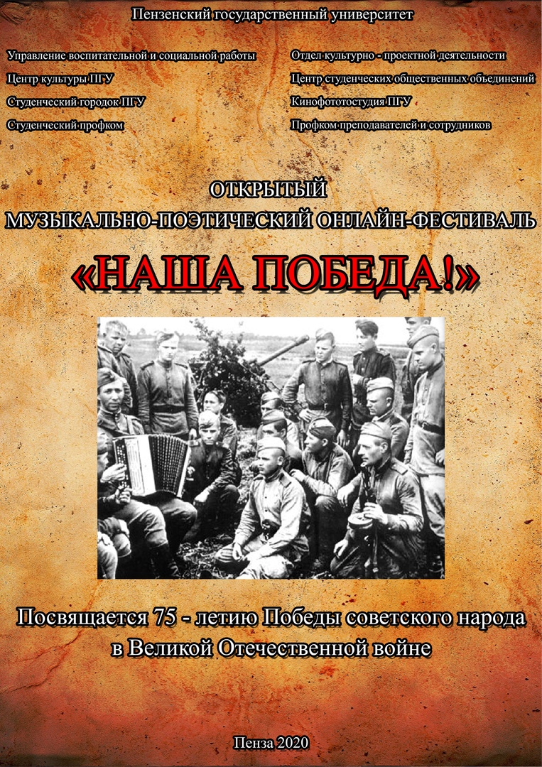 В преддверии празднования 75 - летия Победы Советского народа в Великой Отечественной войне отдел Культурно-проектной деятельности ПГУ запустил открытый музыкально-поэтический онлайн-фестиваль ПГУ "Наша Победа!".