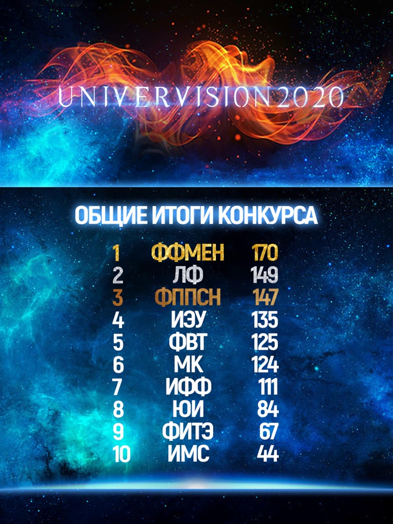 Победу одержал Факультет физико-математических и естественных наук с победой и Алена Базанова! Это первая победа для ФФМЕНа и Педагогического института на Конкурсе песни Универвидение! Именно ФФМЕН и жюри, и факультеты поставили на первое место.