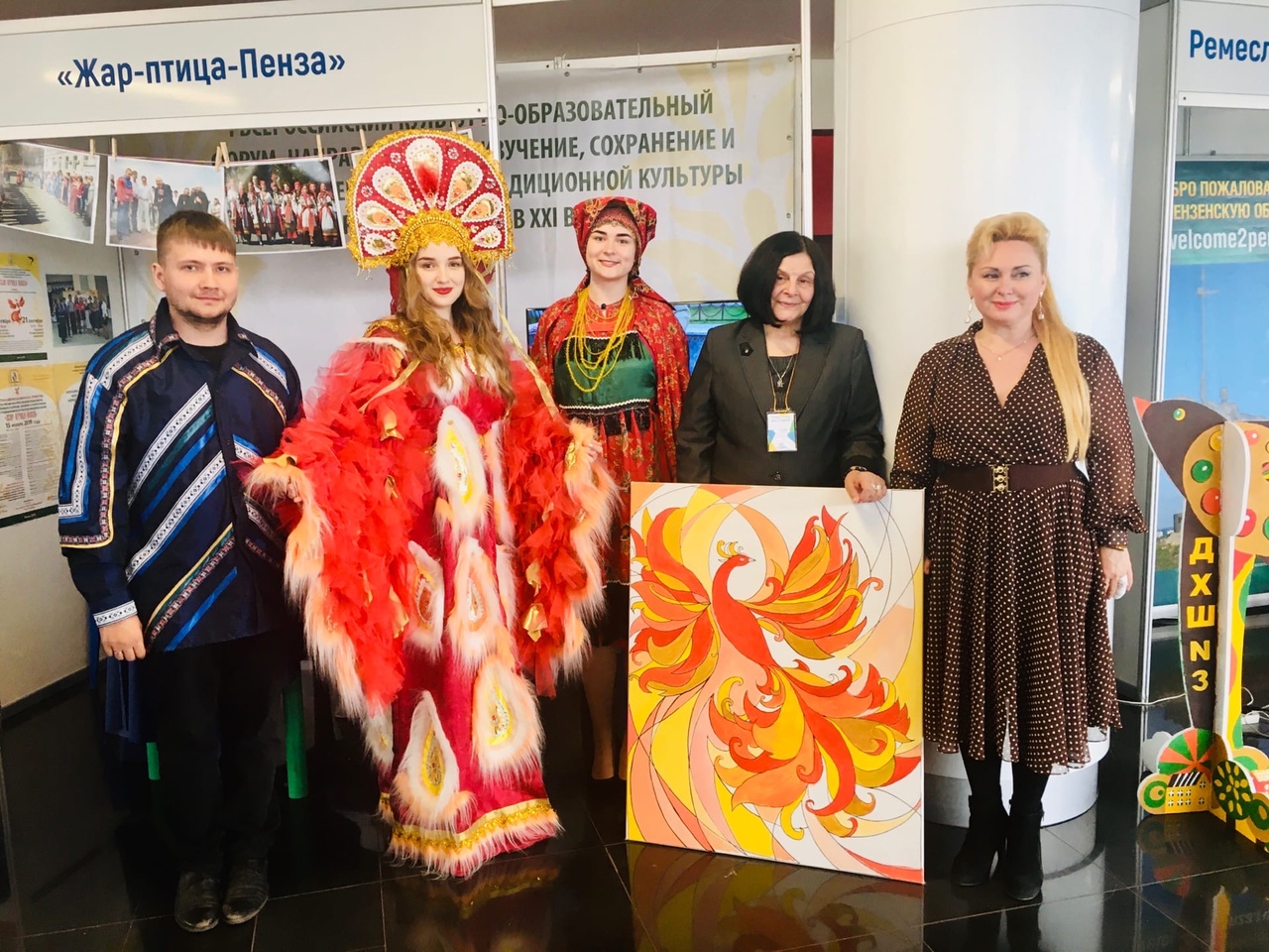 На нашей выставочной площадке проекта работали две интерактивные Арт-зоны «Птица дивная», в которой можно было каждому посетителю выставки порисовать акриловыми красками макет жар-птицы, созданный преподавателем ДХШ № 3 г. Пензы Татьяной Чагоровой. И порисовать вместе с студентами Пензенского художественного училища двух моделей, наряженных в костюм 19 века села Канаевка Гороищенского района Пензенской области и «Жар-птицы».