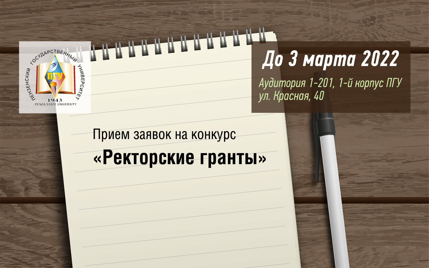 31 января 2022 г. начался прием заявок на конкурс исследовательских проектов «Ректорские гранты» среди обучающихся Пензенского государственного университета по программам бакалавриата, специалитета, магистратуры, ординатуры в инициативном порядке и коллективов студенческих научных кружков и студенческих конструкторских бюро.